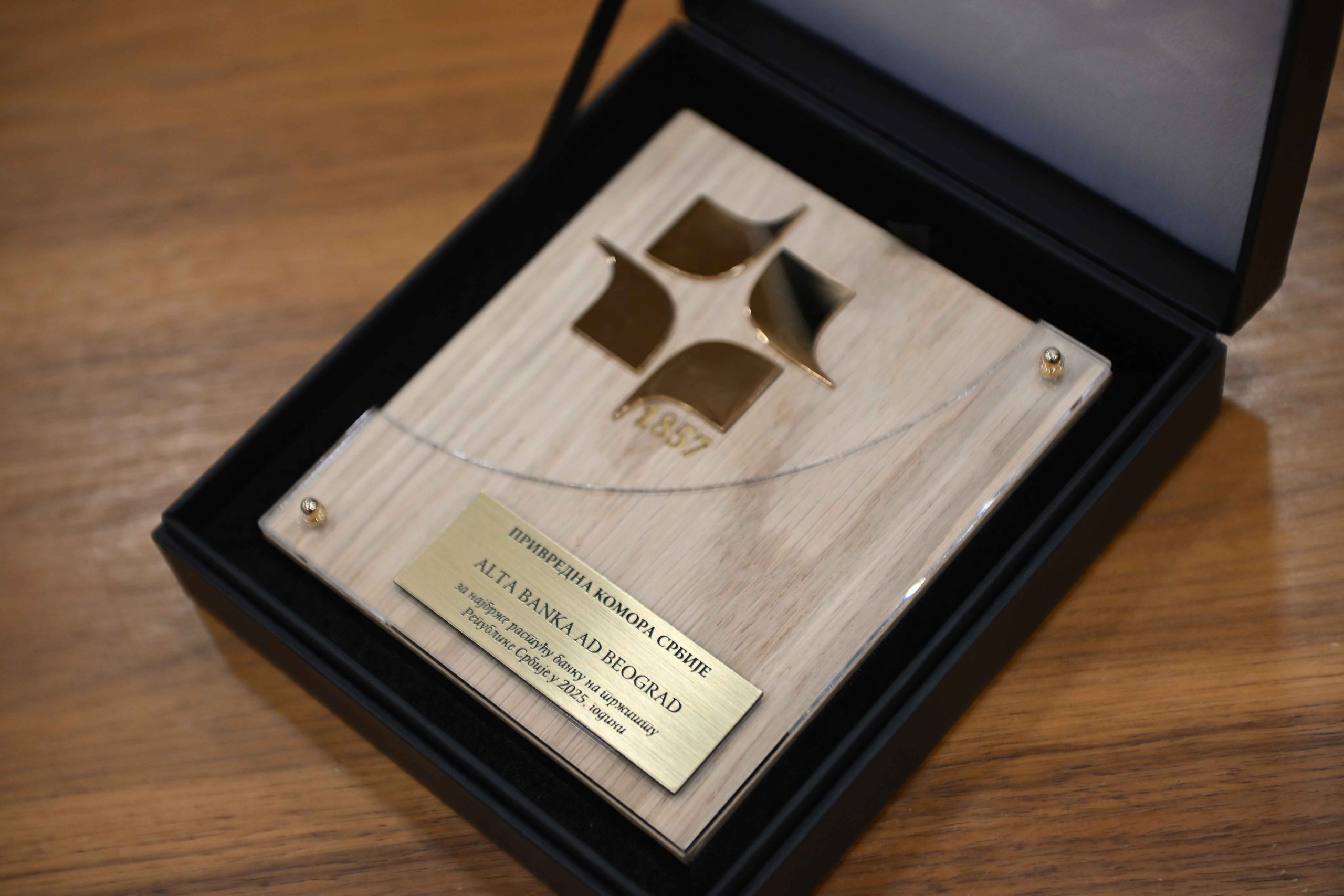 ALTA Bank crowned yet another successful business year with recognition from the Chamber of Commerce and Industry of Serbia as the fastest-growing bank in the country’s market. The plaque for achievement in 2025 was today presented to the President of ALTA Bank’s Executive Board, Dr. Una Sikimić.